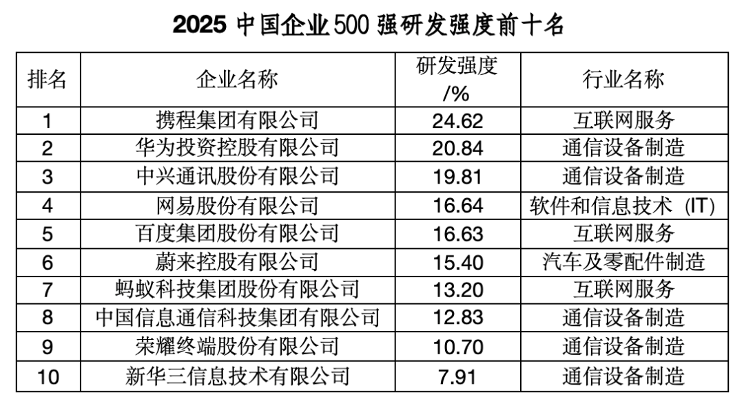 2025中国企业500强(450家企业)共投入研发费用1.73万亿元,平均研发强度创下1.95%的新高,连续第8年提升;近六成企业的研发强度同比都有所提升。值得一提的是,研发强度前十名有五家企业来自通信设备制造业。