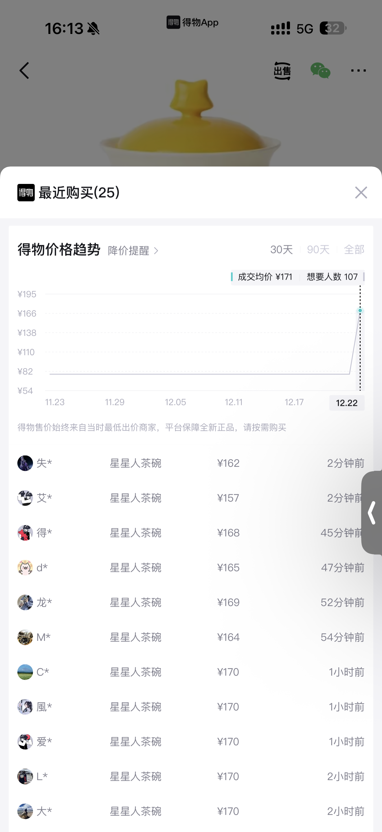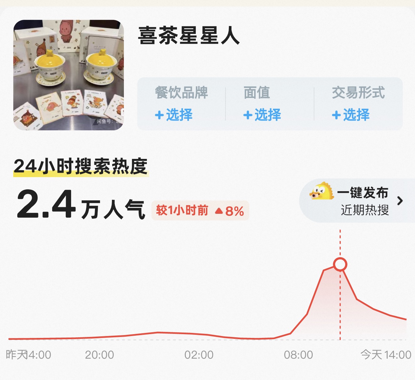 此次联名活动的热度也体现在潮流交易平台,记者注意到,在得物App,联名茶碗成交均价171元,有25人购入;两个徽章分别售价96元、99元,一套售价144元,有一人购入。在千岛App,联名茶碗售价在109元至180元不等,徽章在36元左右,未显示销售数。闲鱼App,此款联名热度飙升,早上9时,话题讨论热度30,最高人气提升到了2.4万。